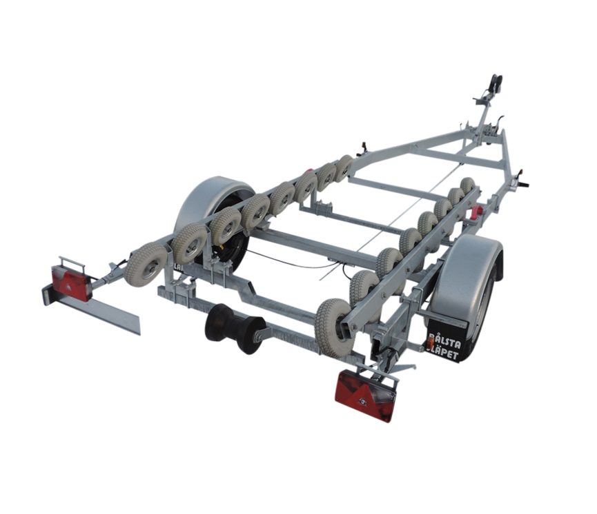 Registrerad båttrailer 80 km/h speciellt anpassad för motorbåtar 5-6,9m & 1380kg med V-skrov & luftsmort skrov. Vagnen har 1 vagga med 8st. rullar/sida på en tippbar ramvagga vilket medför att rullarna ligger mot skrovet i en linje & klarar stegen på ett luftsmort skrov. Båten ligger stabilt, och du kan hantera i läggning och upptagning själv.